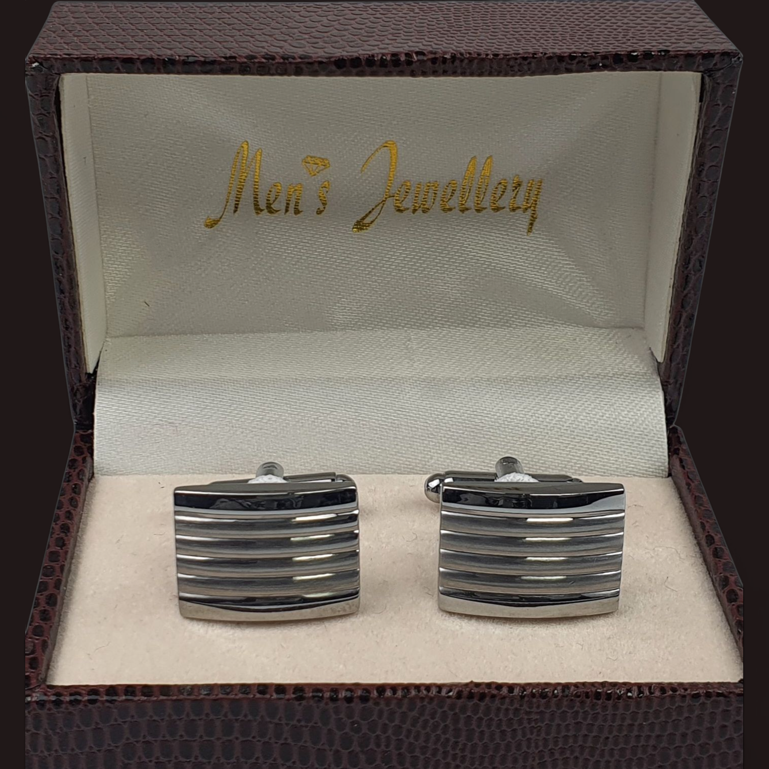Efektowne spinki do mankietów. Spinają wieloletnią tradycję oraz wyszukany styl w ponad czasowej obowiązkowej biżuterii męskiej. Tłoczona poziomymi zagłębieniami na głowicy spinki. Wykonana jest ze stali nierdzewnej pokrytej nieścieralną warstwą galwanizacyjną. Ten surowiec od lat jest materiałem dekoracyjnym stosowanym w męskiej biżuterii – fantastyczna gra ułożonego połączenia dwóch struktur górnej części spinki, przykuwa wzrok i podkreśla wyjątkowość całej konstrukcji tej stylizacji. Spinki do koszuli to idealny dodatek na wielkie uroczystości, np. ślub lub bankiet.
