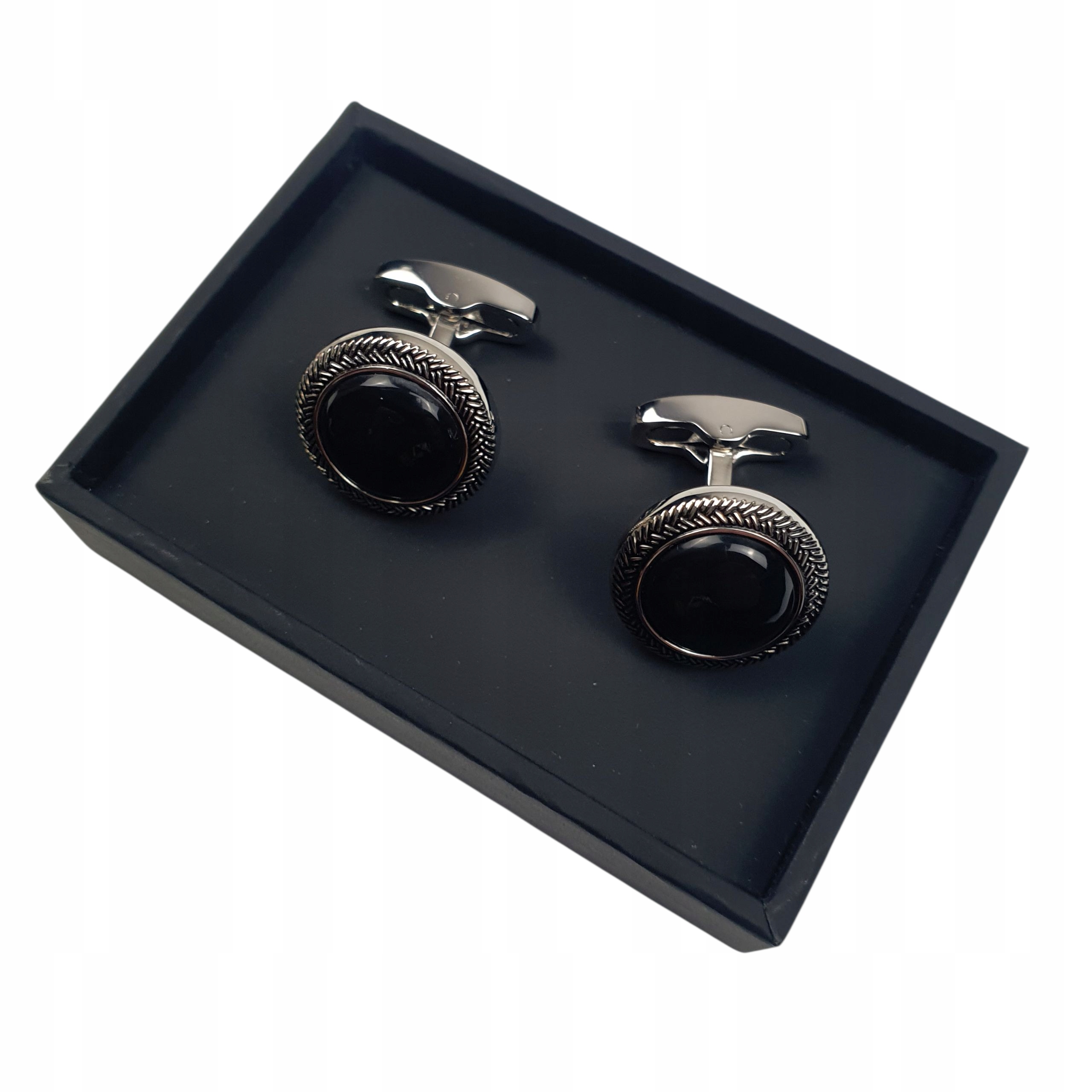 Efektowne spinki do mankietów łączące klasykę, tradycję i nowoczesny styl. W części górnej – czarny kamień w głowicy spinki. Wykonana ze stali. Ten surowiec od lat jest materiałem dekoracyjnym stosowanym w męskiej biżuterii – fantastyczna gra ułożonego połączenia dwóch struktur górnej części spinki, przykuwa wzrok i podkreśla wyjątkowość całej konstrukcji tej stylizacji. Spinki do koszuli to idealny dodatek na wielkie uroczystości, np. ślub lub bankiet.